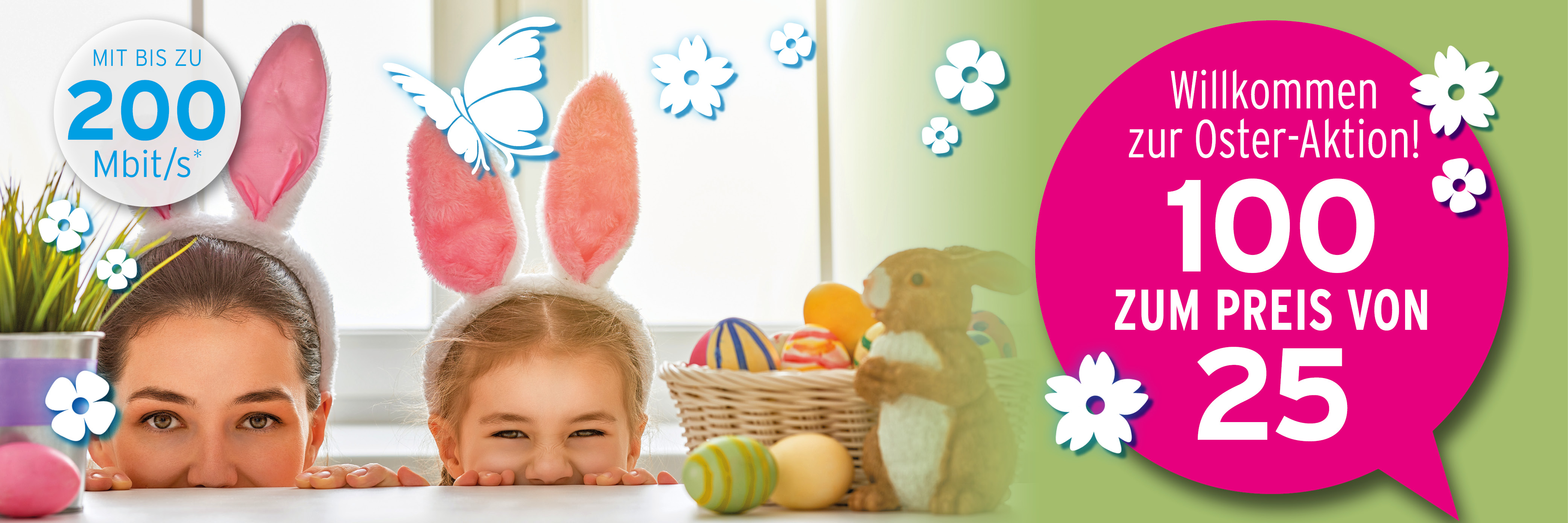 Für Neubestellungen* vom 13.04.2022 bis 25.04.2022 legen wir zu Ostern unseren beliebten Cyber Deal ins Körbchen: 100 Mbit/s buchen, aber in den ersten 12 Monaten nur 25 Mbit/s bezahlen! Nach Abschluss der ersten 12 Monate entscheiden Sie sich dann einfach in welchen Tarif Sie dauerhaft wechseln möchten!