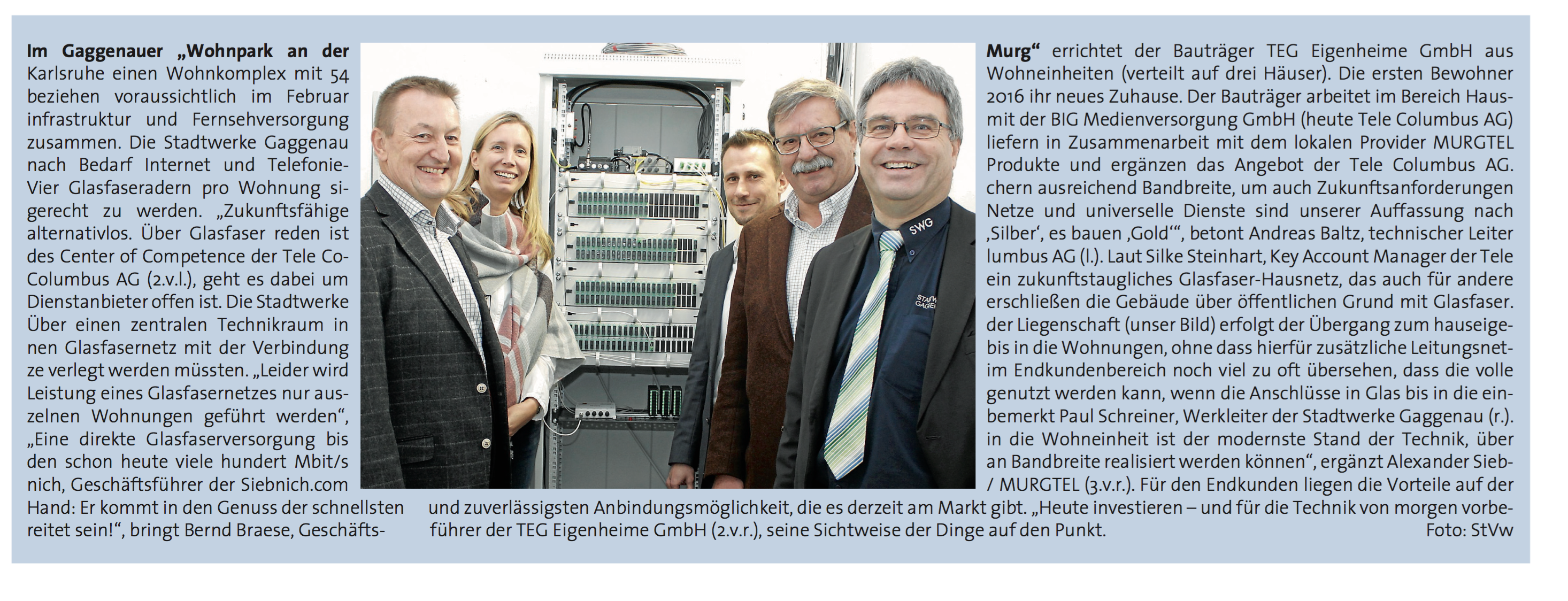 Pressebericht aus der Gaggenauer - Woche 49/2015 des Nussbaum Medien Verlages über das FTTH - Projekt im Wohnpark an der Murg.